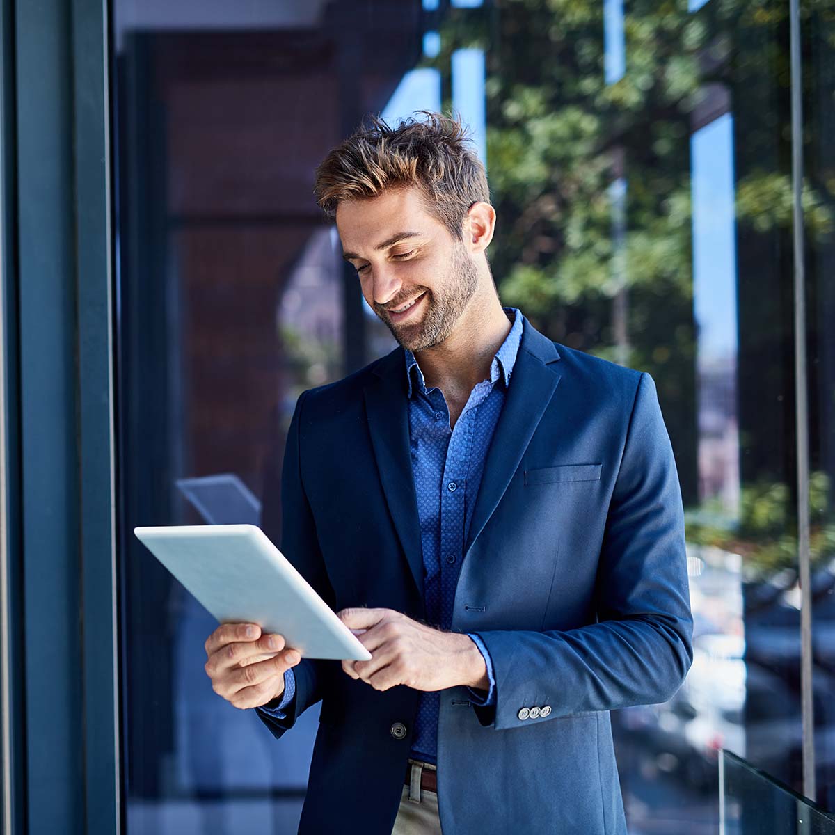 Young businessman busy on a digital tablet.