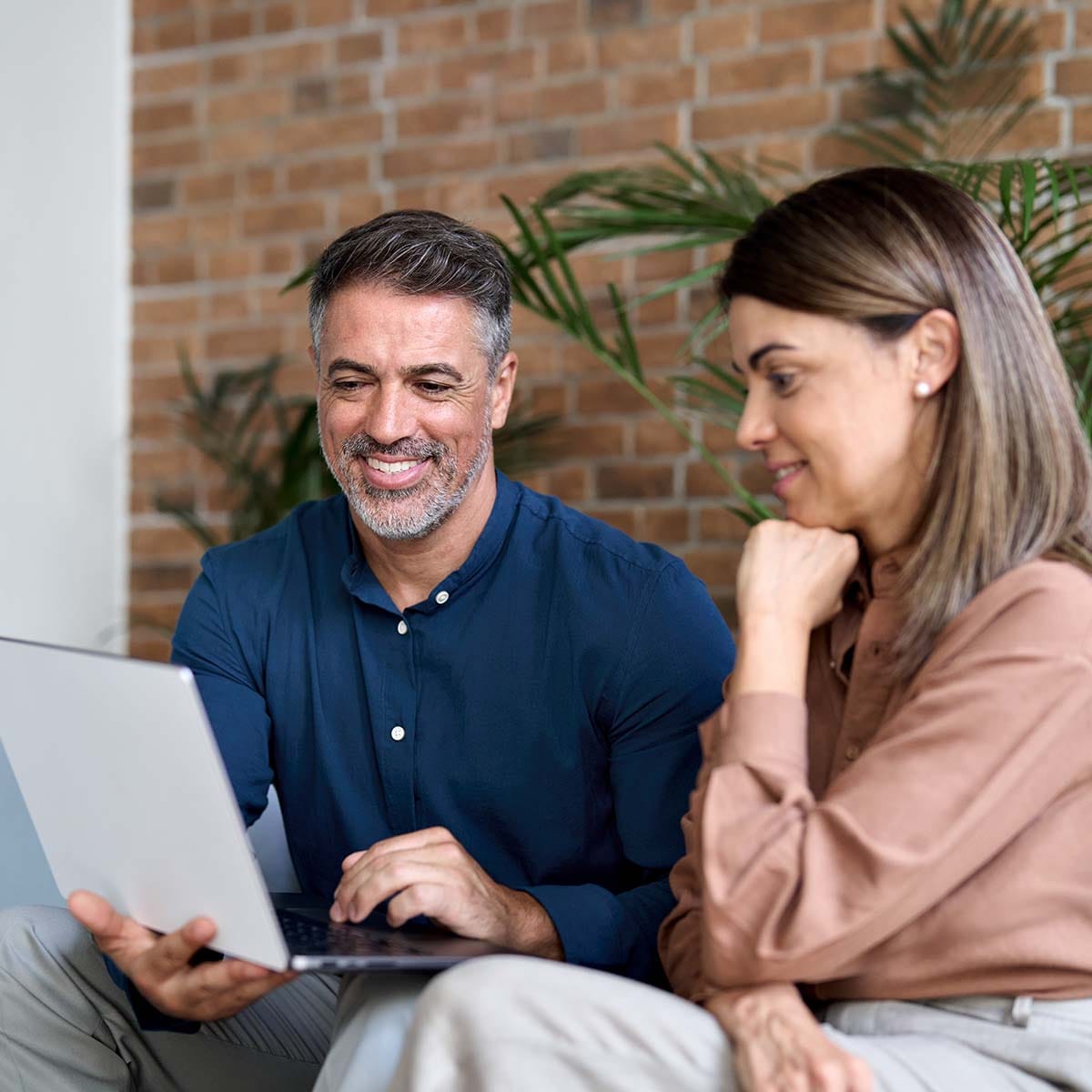 Two happy professionals working using laptop and talking sitting in office on sofa.