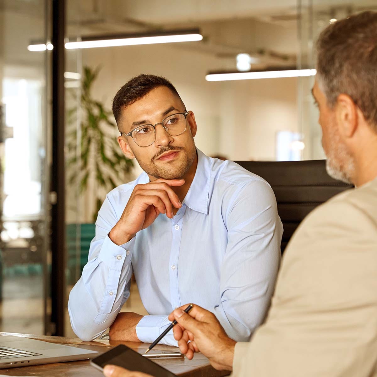 Busy executive team of two business men discussing digital finance banking project strategy working in office with laptop and tablet.