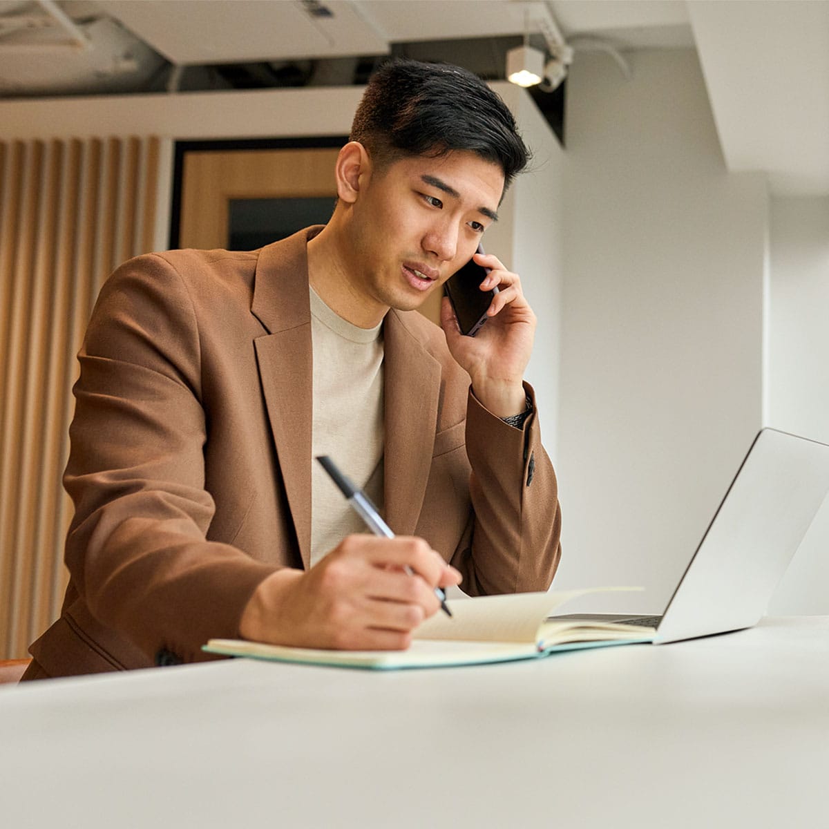 Business man talking over phone while taking notes and looking a computer screen